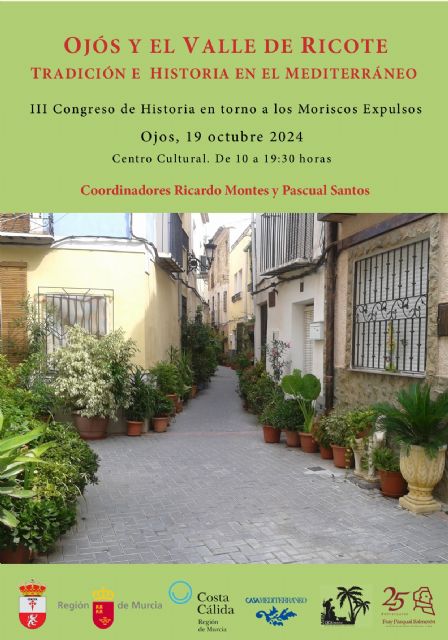 Dentro de las actividades programadas por la celebración del 25 Aniversario del Centro de Estudios Históricos Fray Pasqual Salmerón de Cieza y coordinado por los historiadores Ricardo Montes Bernárdez y Pascual Santos López, el próximo sábado 19 de octubre de 2024 tendrá lugar en el Centro Cultural de Ojós a partir de la 10:00 horas la tercera convocatoria de este interesante Congreso de Ojós y el Valle de Ricote. Tradición e Historia en el Mediterráneo.